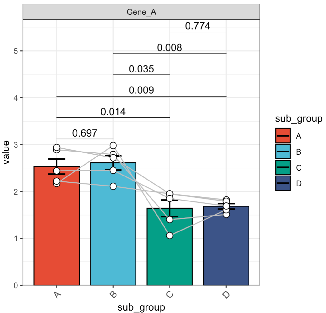 🏷️示例8: 亚组分析。 在进行多组分析时,如果数据属于正态分布,我们推荐使用tukey.hsd进行两两比较。如果数据非正态分布,也可以选择dunn.test进行两两比较。