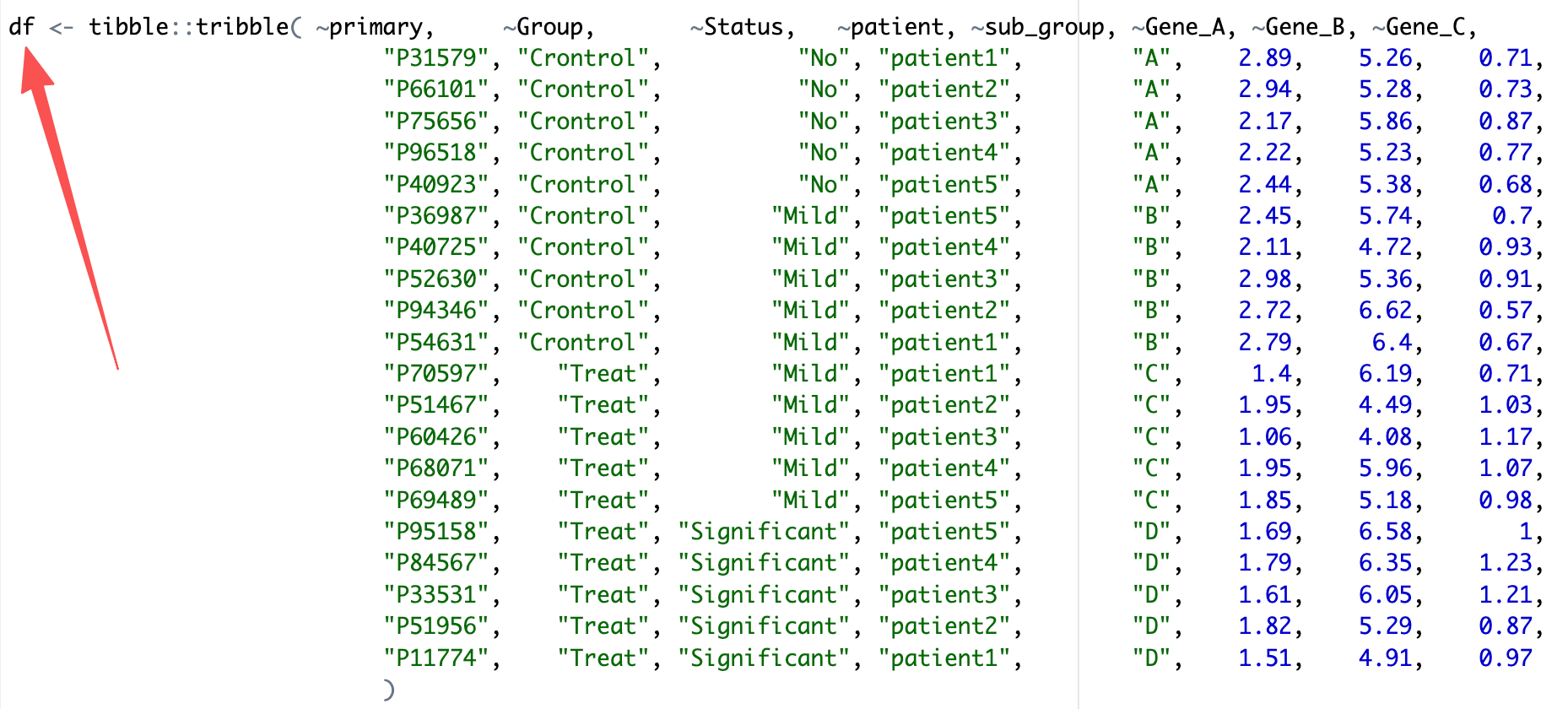 Step2:在Rstudio界面,已自动地将复制的数据整理成表格格式,使用datapasta包的tribble_paste模块能将该数据框直接赋值为df并存储。