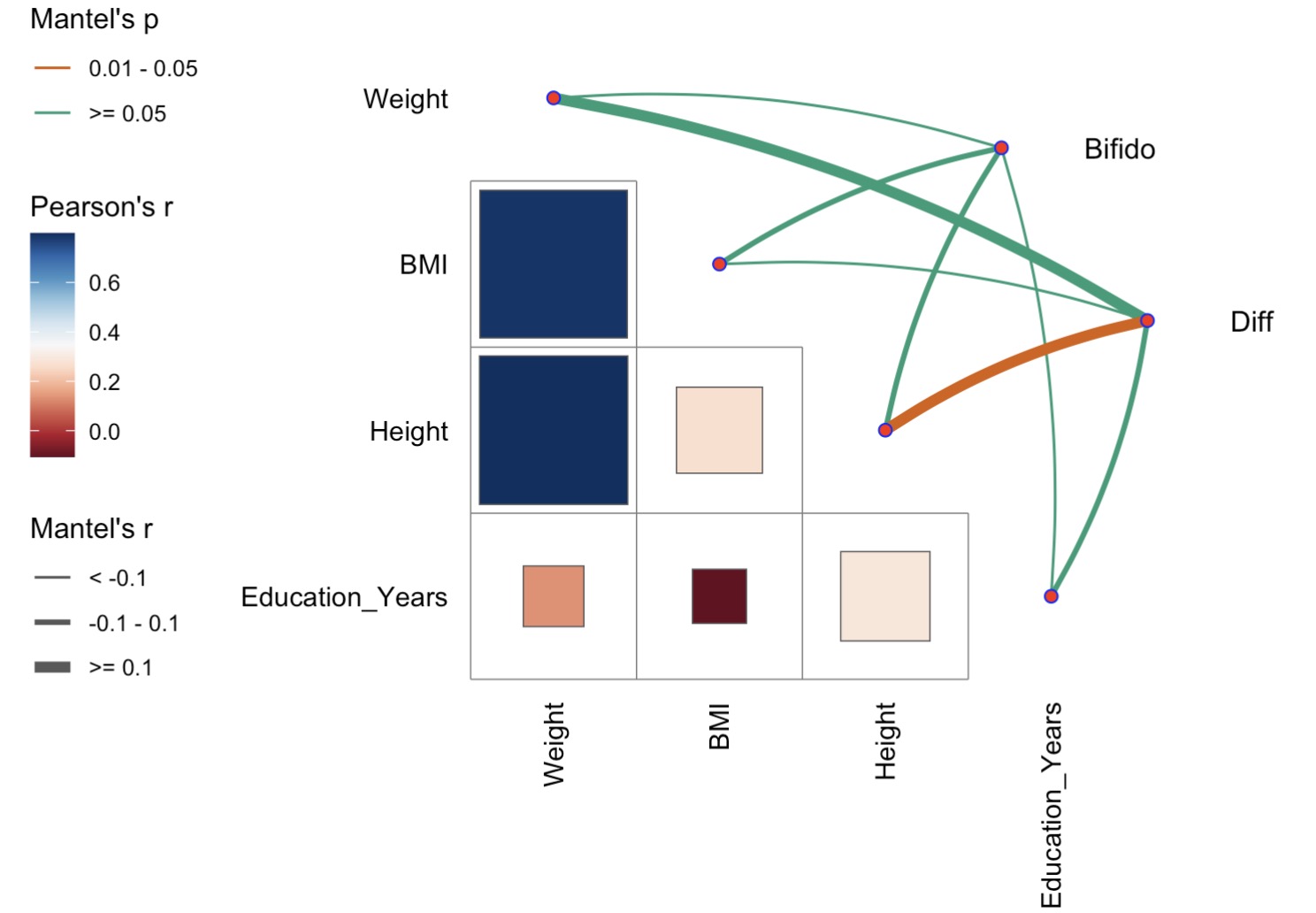 🏷️示例:利用BMI计算差异菌属和双歧杆菌的微生物集与表型数据进行mantel分析