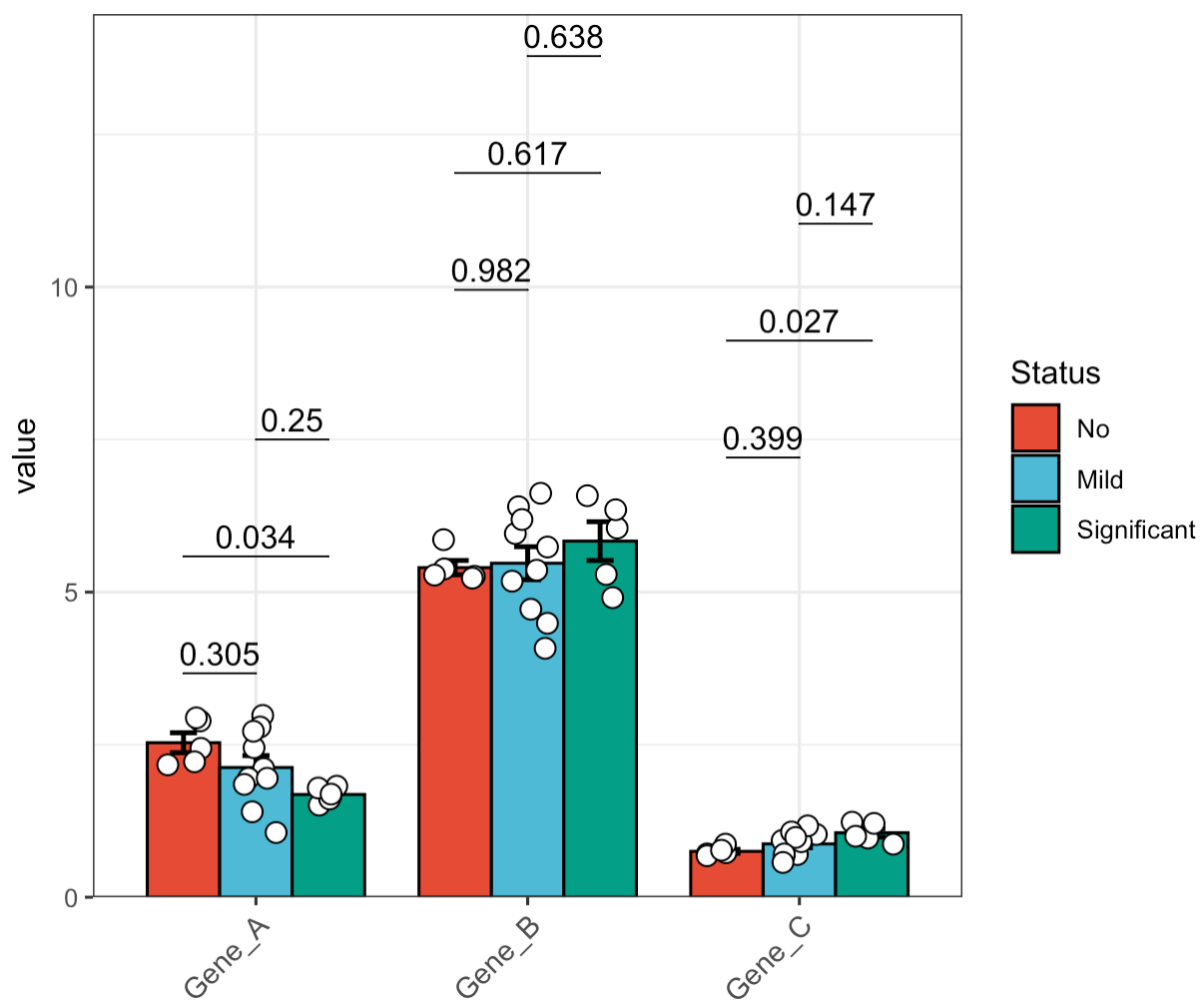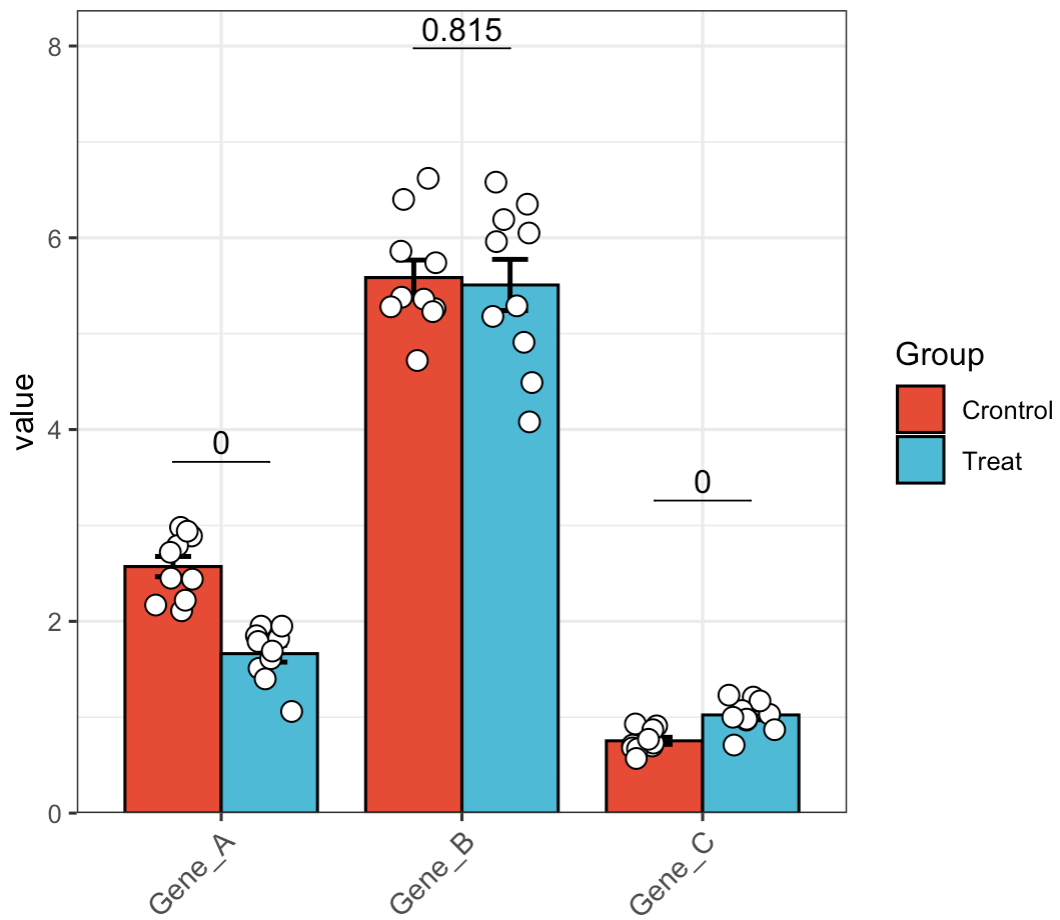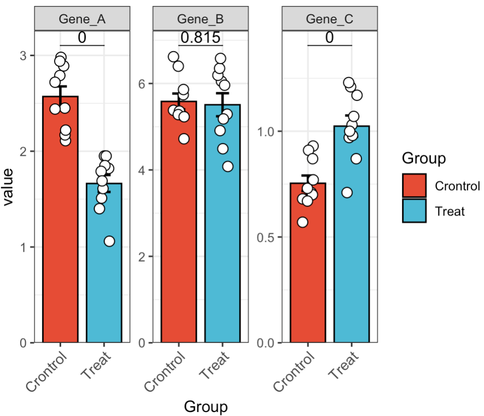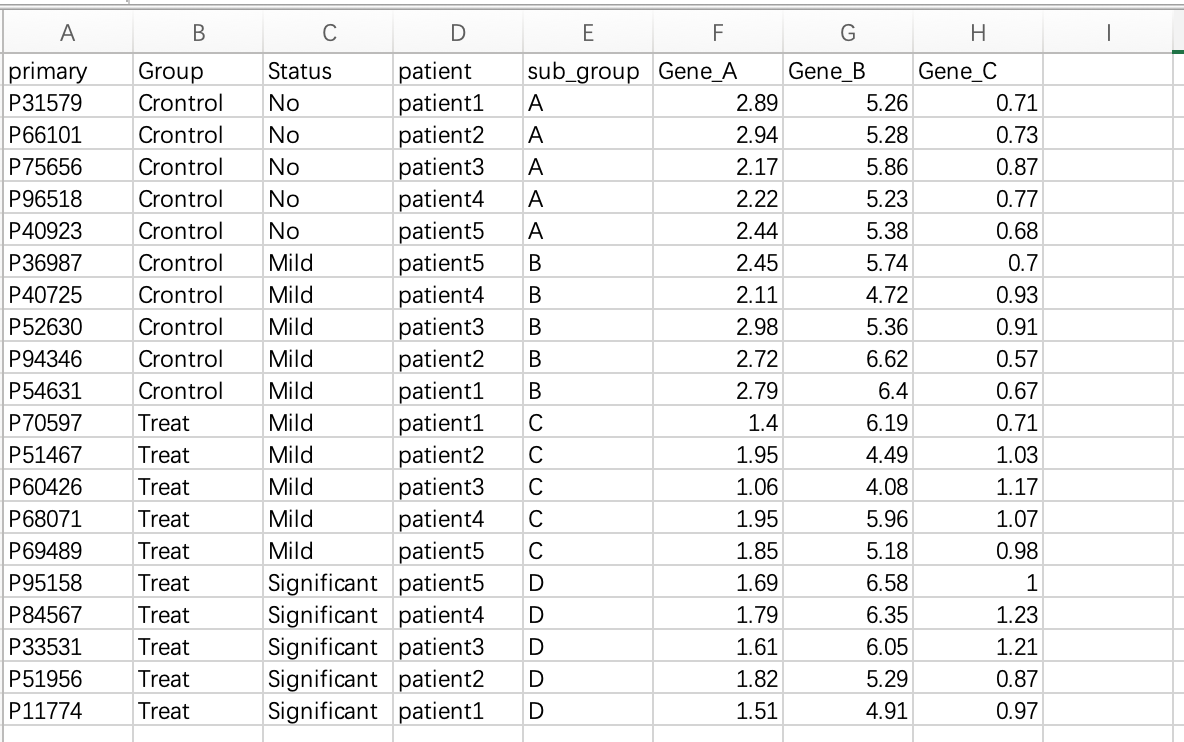 Step1:Copy the required data from an Excel file and execute the following in R. Gene_A, Gene_B, and Gene_C represent qPCR expression values, while the other columns contain grouping information.